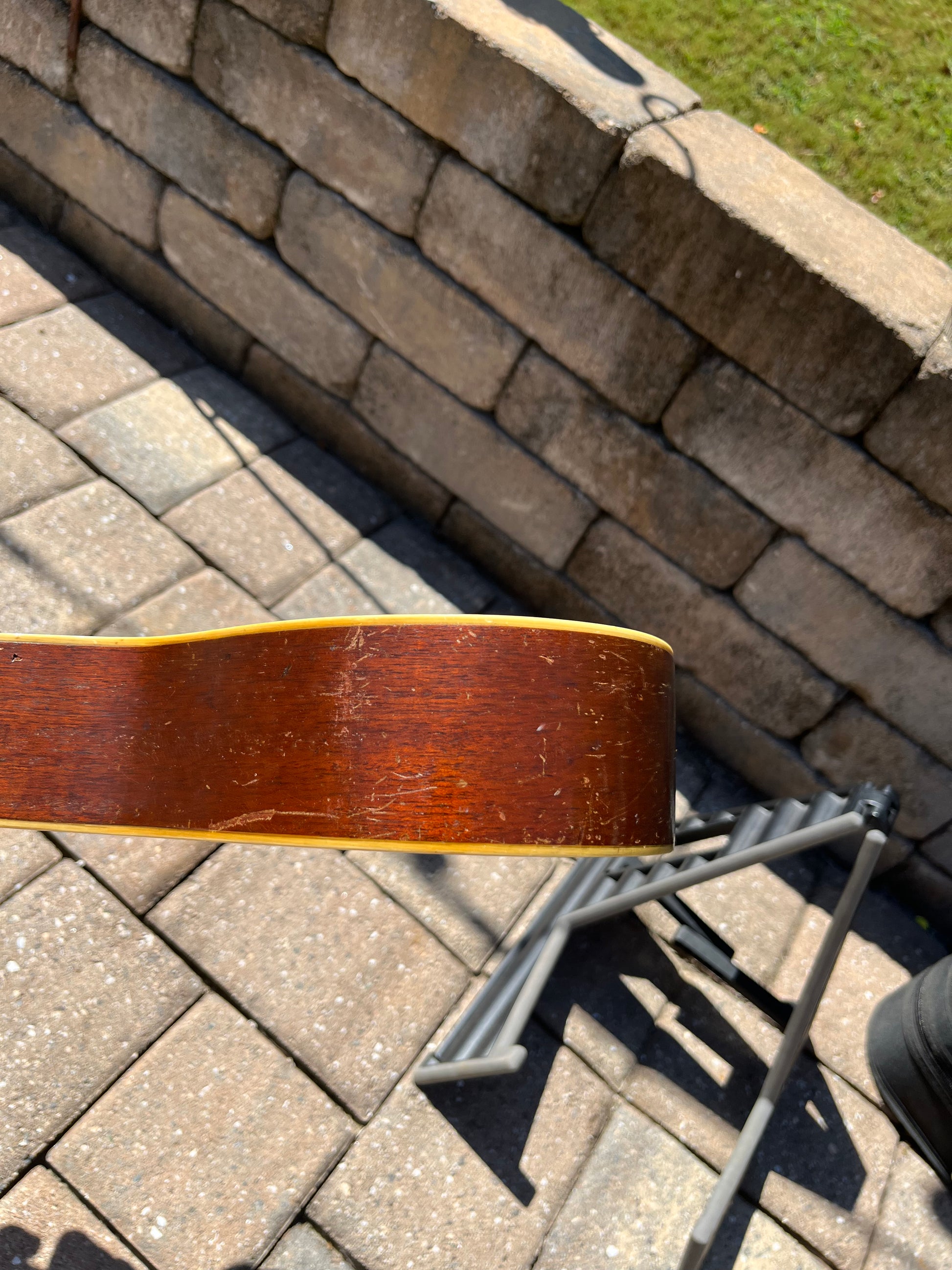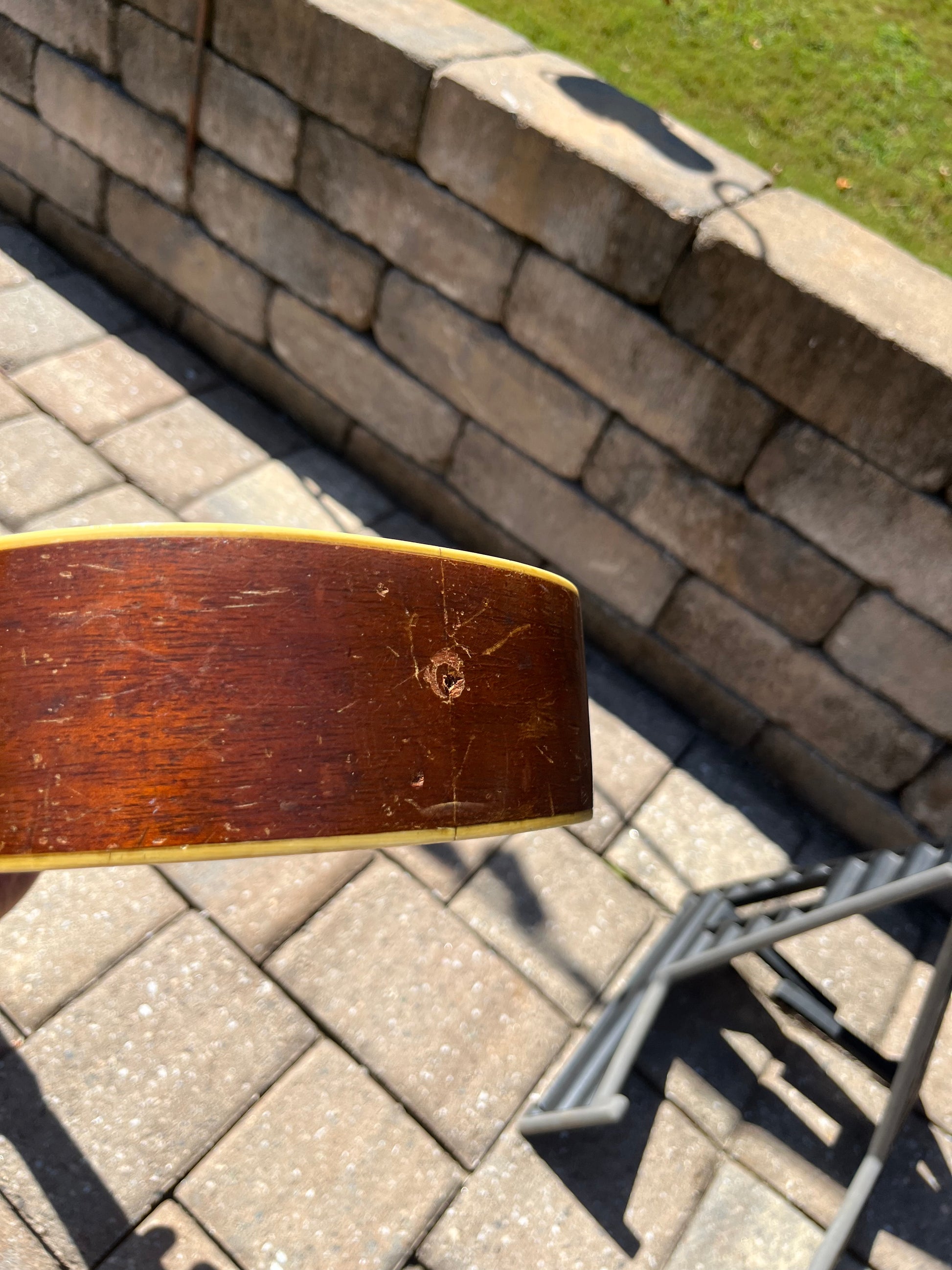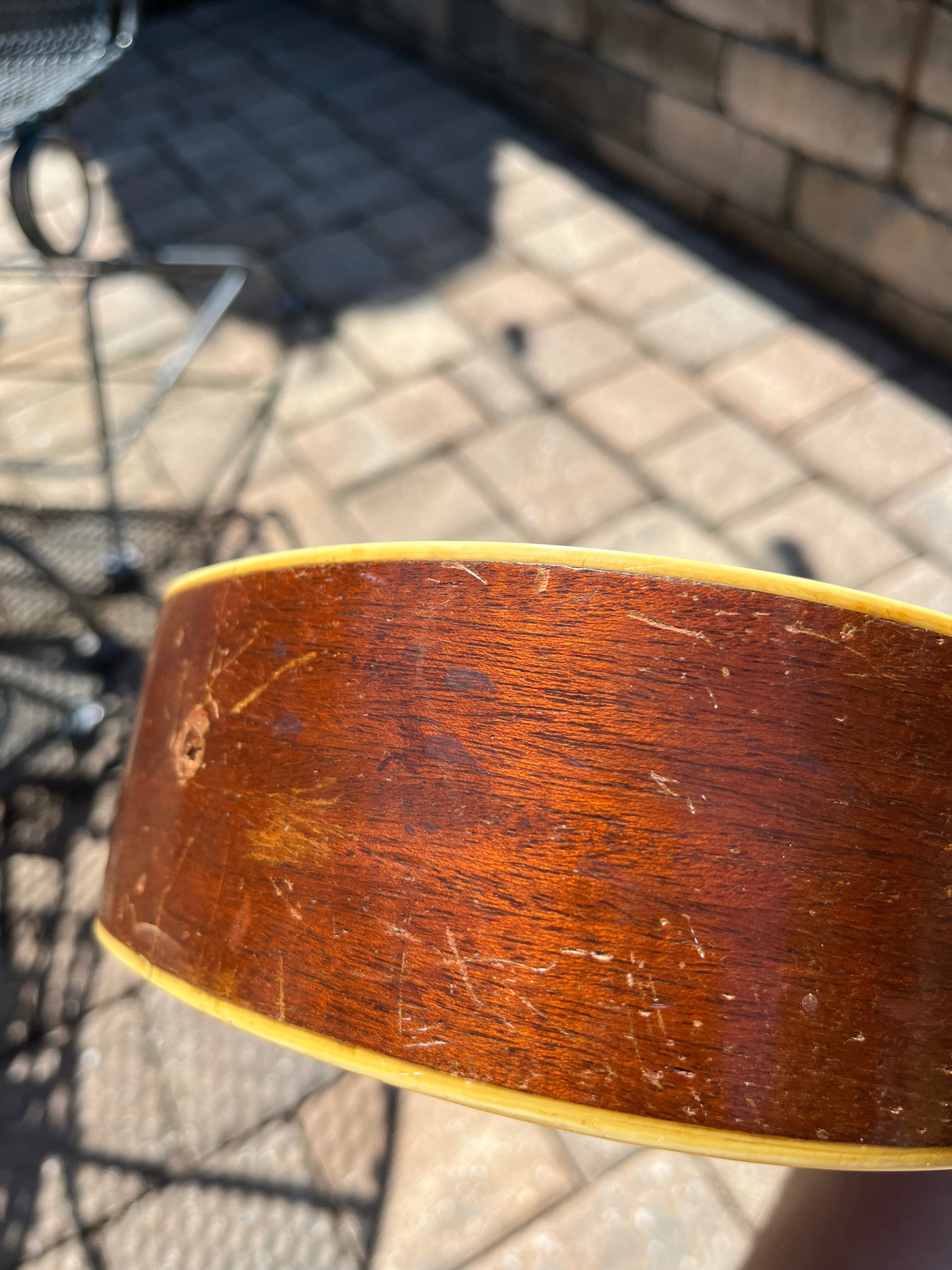 Vintage Washburn Ukulele made by Lyon & Healy. This concert ukulele is made out of all mahogany wood. Plastic sound hole ring, ukulele is 24 inches long with the body being 11.5 inches. The nut is 1 5/8 wide. Body shows lots of character play wear but no actual cracks. There was a strap button put on this at one point but is gone now. Back of the neck shows some light scratches and wear but is still in fairly good condition. Bridge pins are different colors but are all old, small pins being very very hard to find. Ukulele will ship in a newer case.