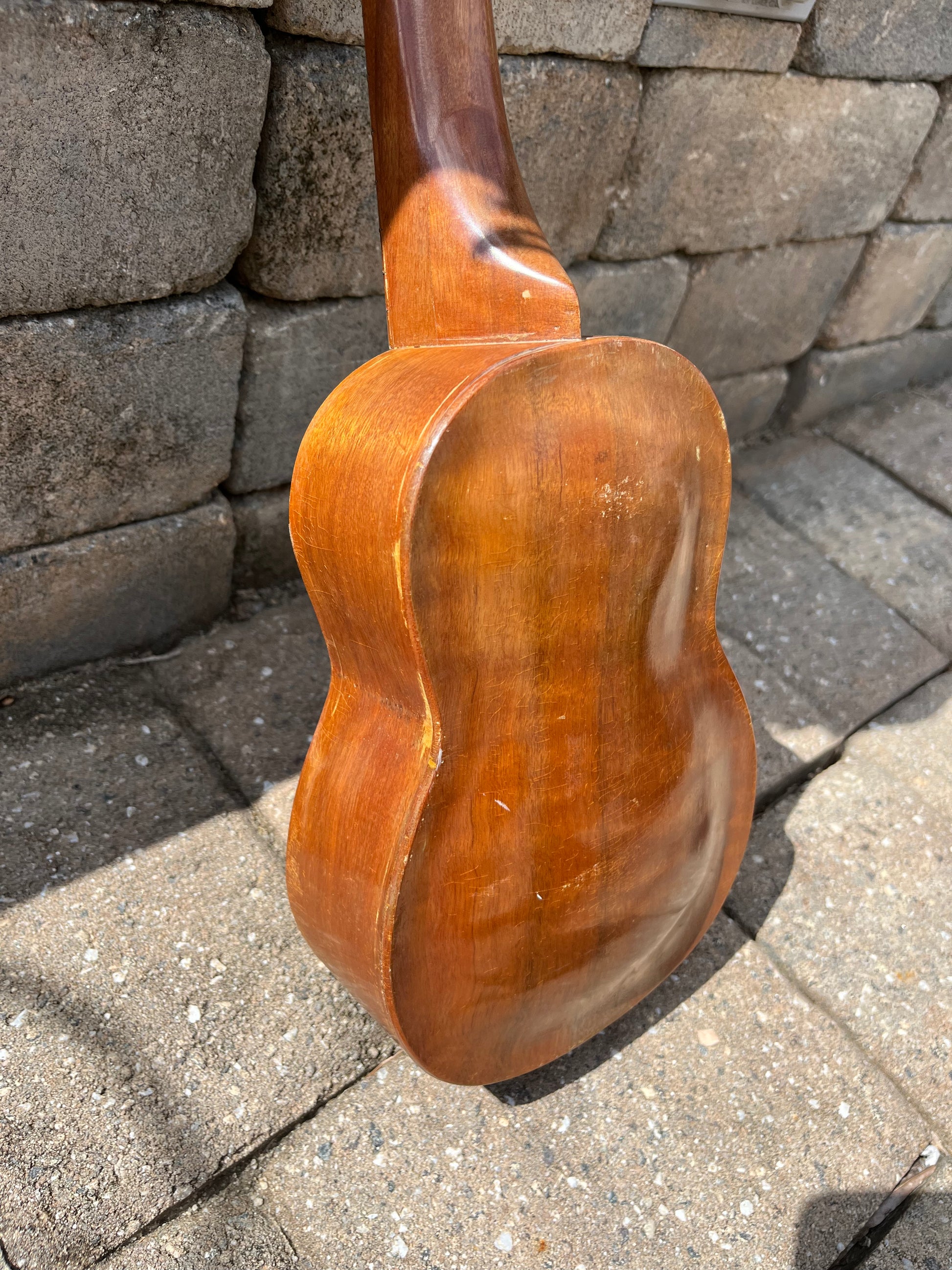 Vintage 1920’s 1930’s soprano ukulele. This ukulele has no name decals while also having little American made features to it. The arched back is rare for ukulele while the wood looks to be monkey pod . Tuners, bridge has strange cut out configurations also which are very unlike any American made pieces I have seen. The top has a few small cracks at the top but over all the ukulele is still a very cool piece of craftsmanship right here. Will ship in a newer gig bag.