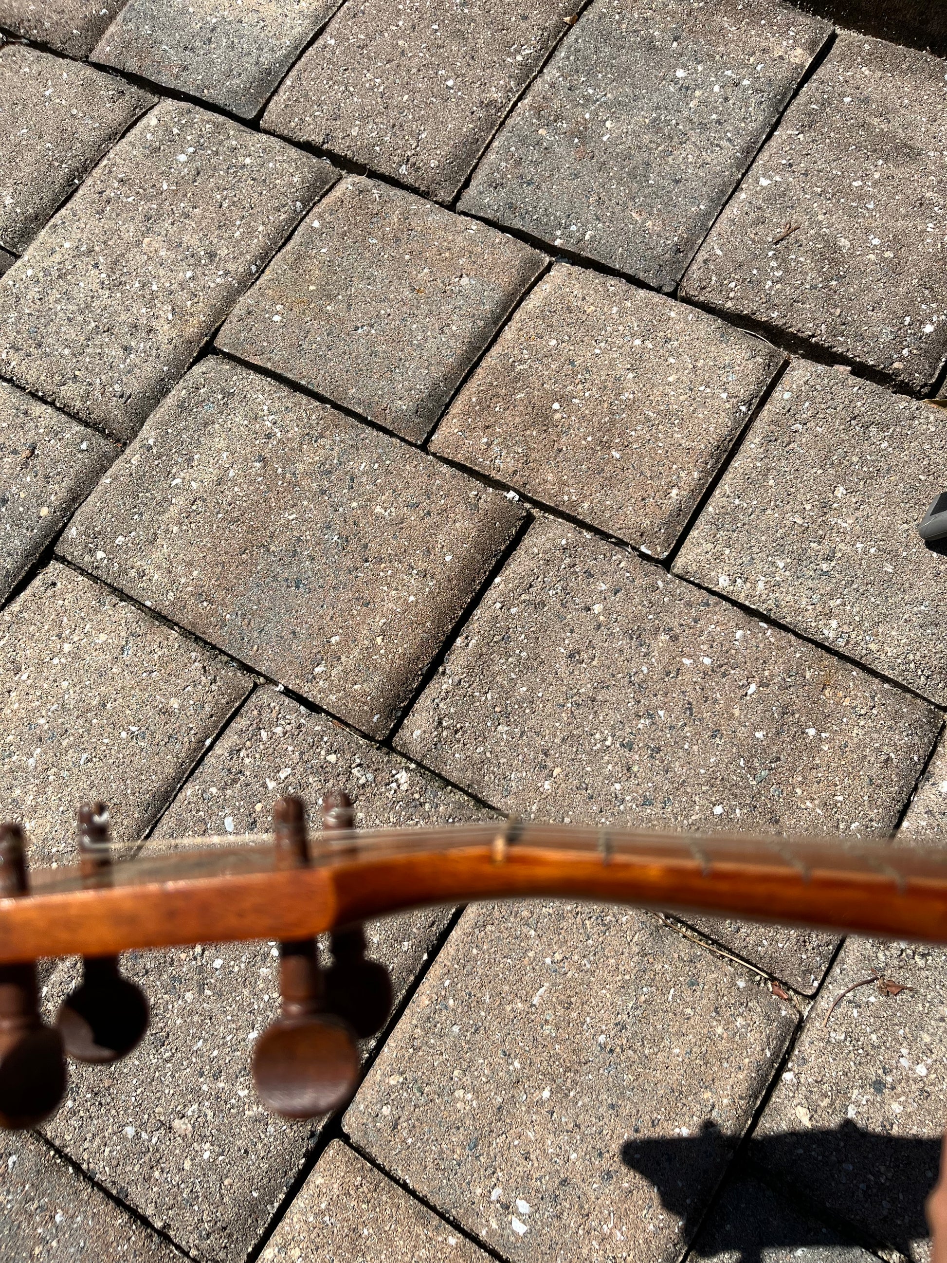 Vintage Kumalae style 1 ukulele made in the 1920’s. This ukulele is made out of Koa wood that was very typical of ukes during this time period. Also this has one of the very early Kumalae Gold Awards decals on the headstock being one of the very early versions from Kumalae. Ukulele shows some significant play wear from over the years starting with one crack on the top right below the neck that goes down to the sound hole. There is also two cracks below the bridge that go to the bottom that I did my best to get pictures of. Top has binding is showing slight cracks wear it is lifting from over the years as well as other places around the body. The back has one long crack from pretty much the top to bottom along with a smaller crack beside it. For ukuleles being over 100 years of age these are all typical in today’s age but still is a great vintage piece with a good tone. Item will ship in the chip board case but I will pack accordingly to make sure it arrives safe and sound.