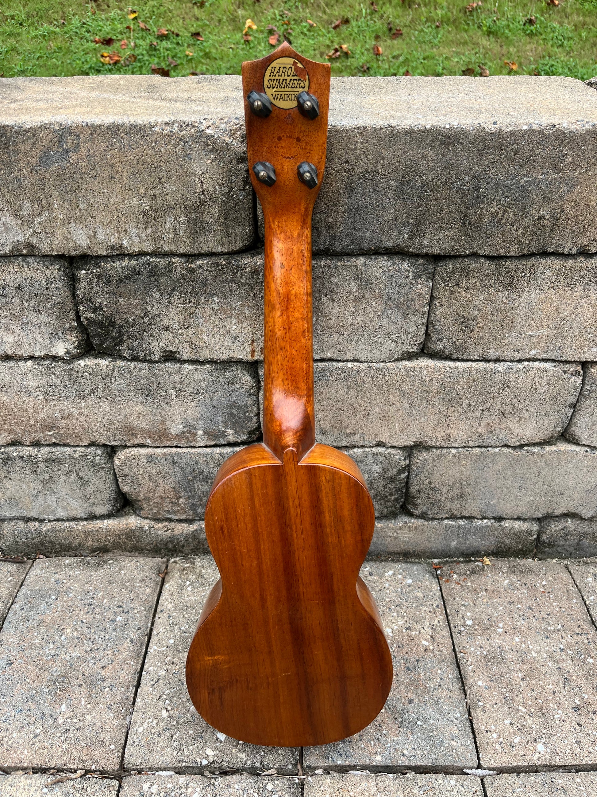 Vintage Aloha ukulele made for Harold L Summers 1930’s. Ukulele is solid koa wood having no cracks while being very play able. Decal on the back of the headstock is stamped Harold Summers Waikiki There is also the official tabu made in Hawaii stamp on the back of the neck that the government made manufactures do to prove they were made in Hawaii.