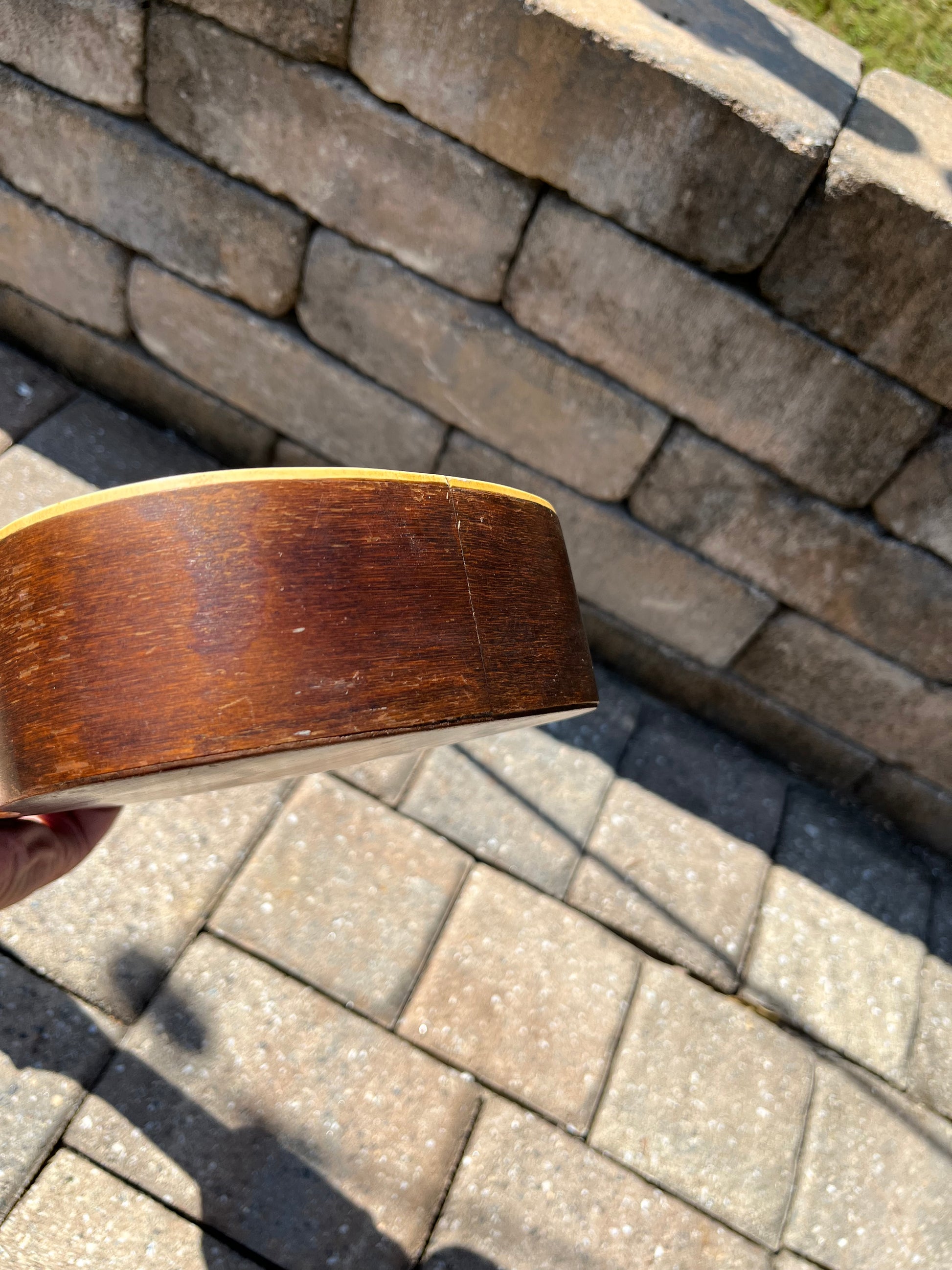 Vintage Regal ukulele made in the 1930’s. This ukulele has the Ha-Ha cartoon character that regal made numerous designs of during this time period. Very cool design that has always been a personal favorite in this collection. Uke shows moderate wear and tear from over the years with your typical dings and scratches around the body. With ukuleles being so light in weight it made is very easy to bump these over close to a 95 year life span. Bridge looks to have been reglued at some point in its life time. Looks to be one small crack on the top also right beside the bridge but this could possibly just be a scratch. The binding is showing very little separation at certain spots but over all is mostly intact. Will ship in a newer padded gig bag case.