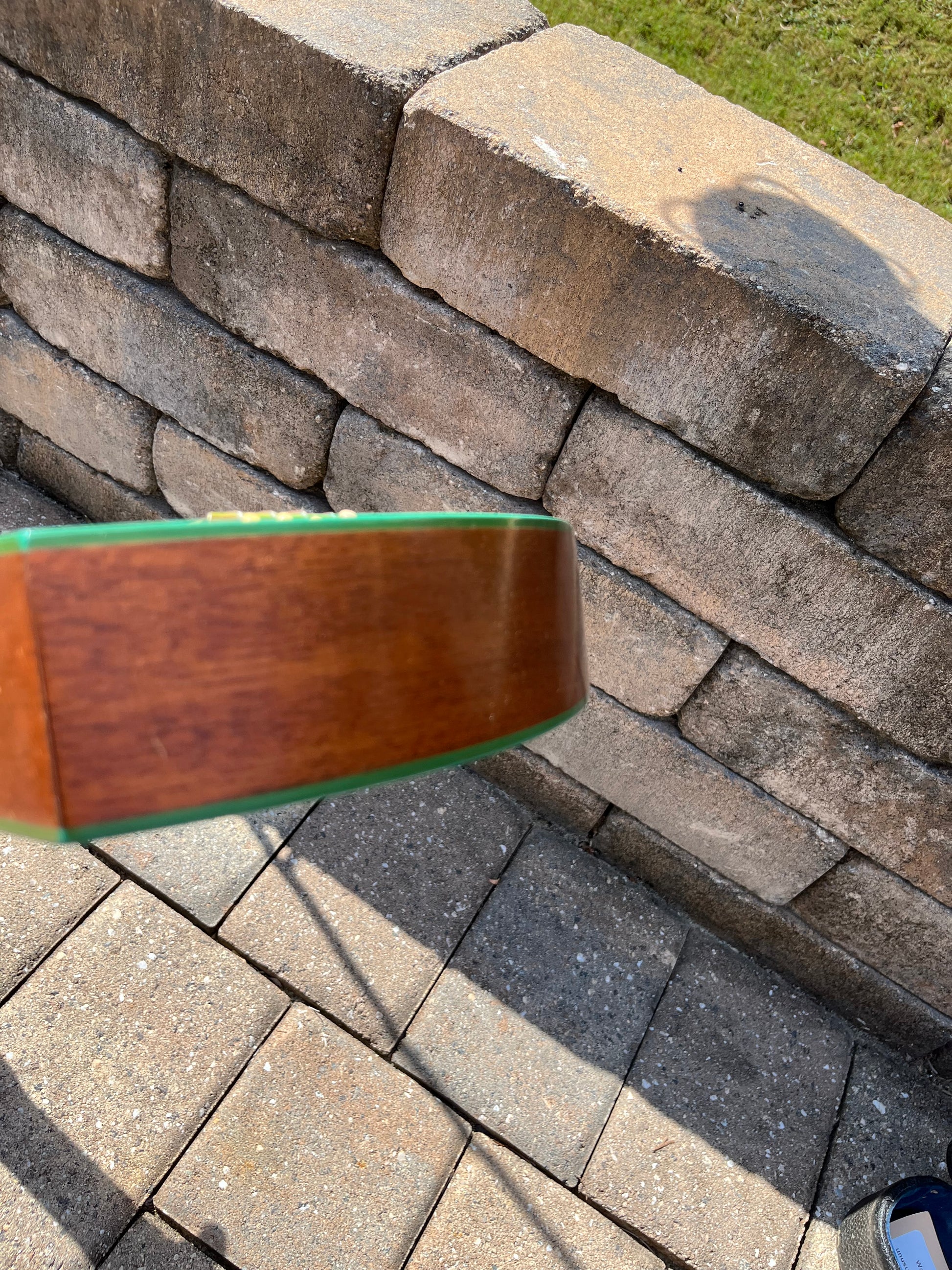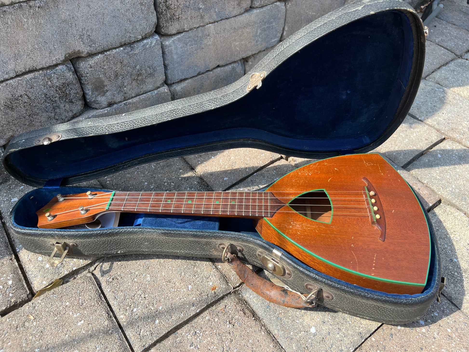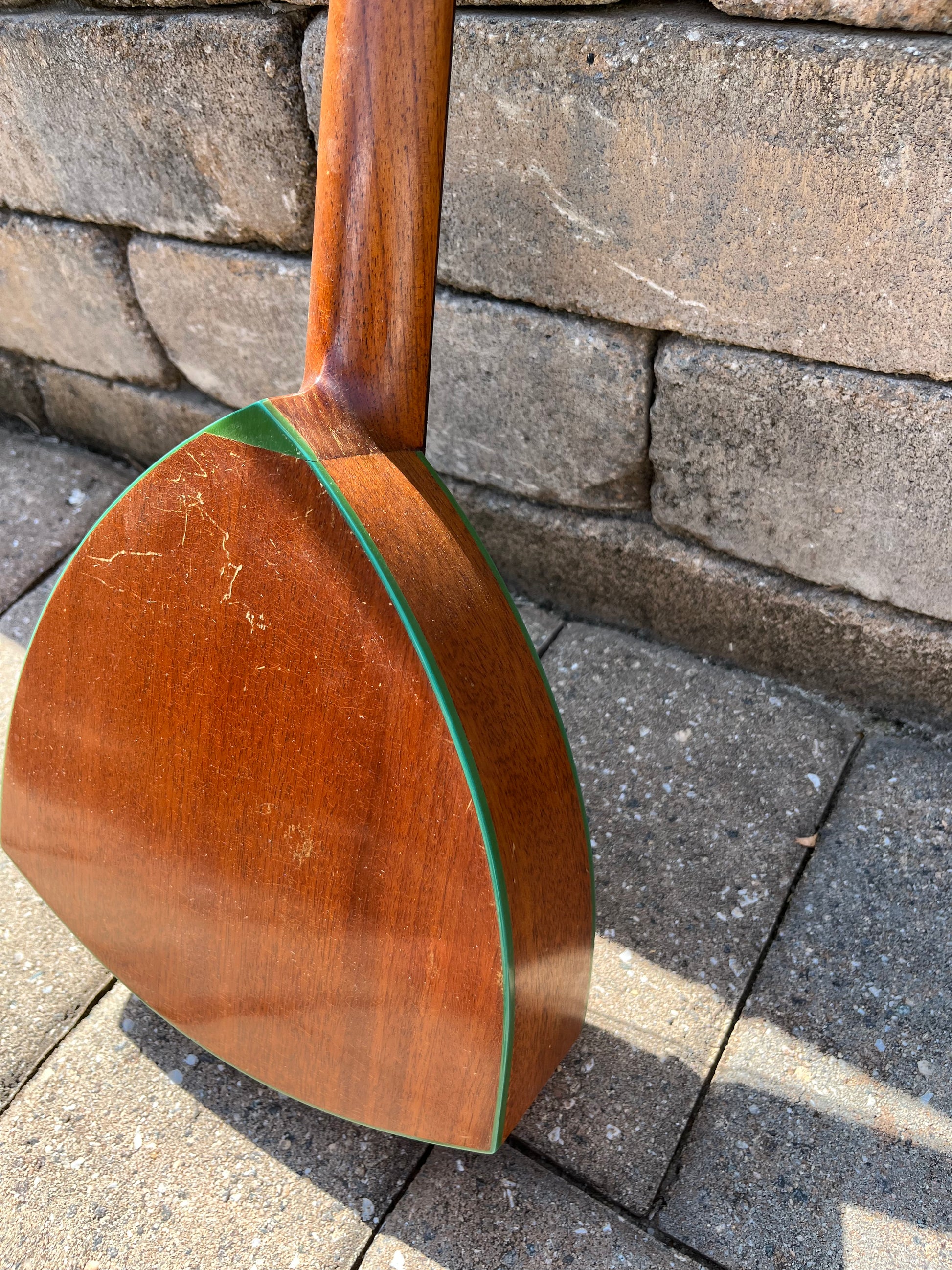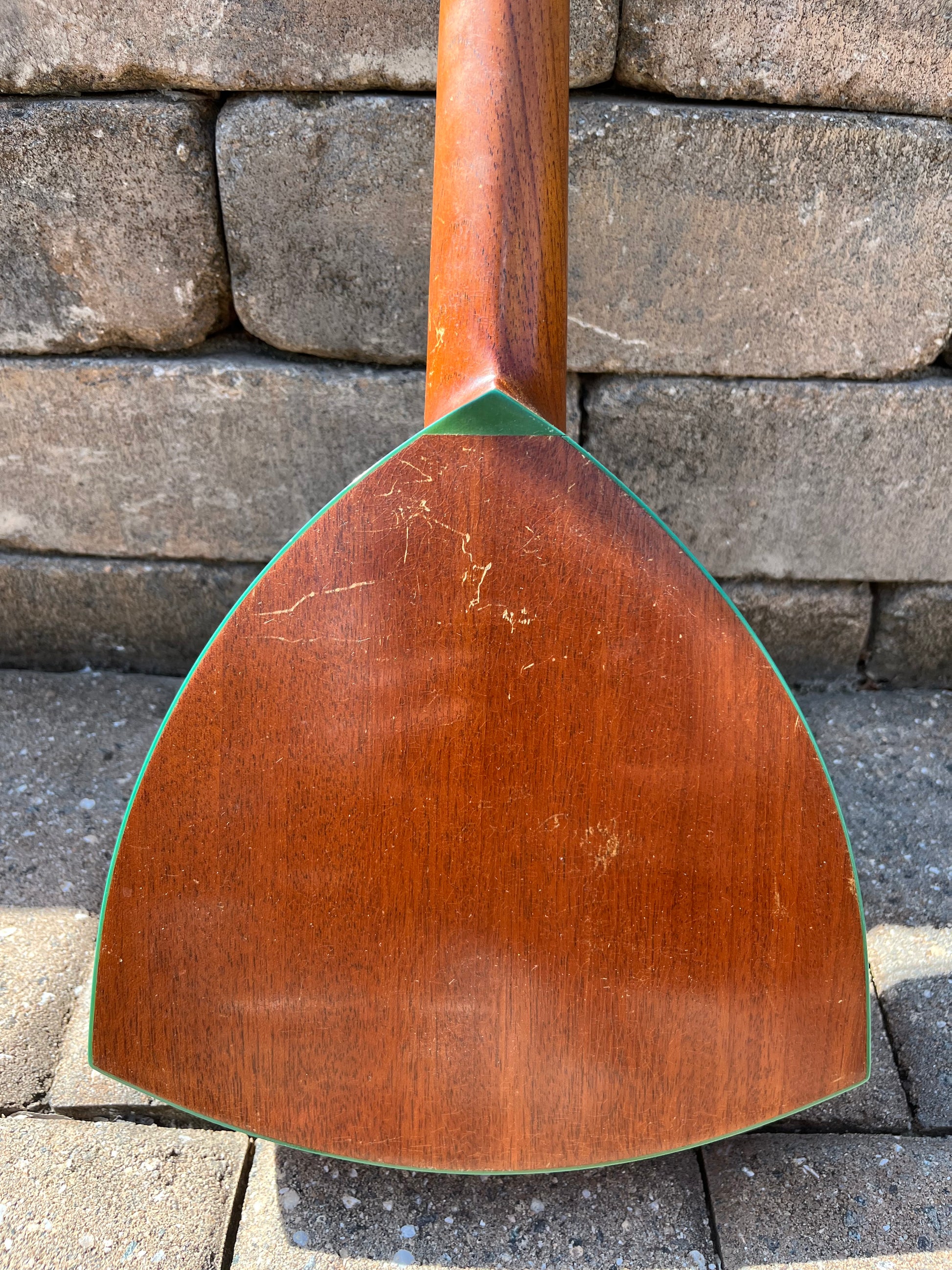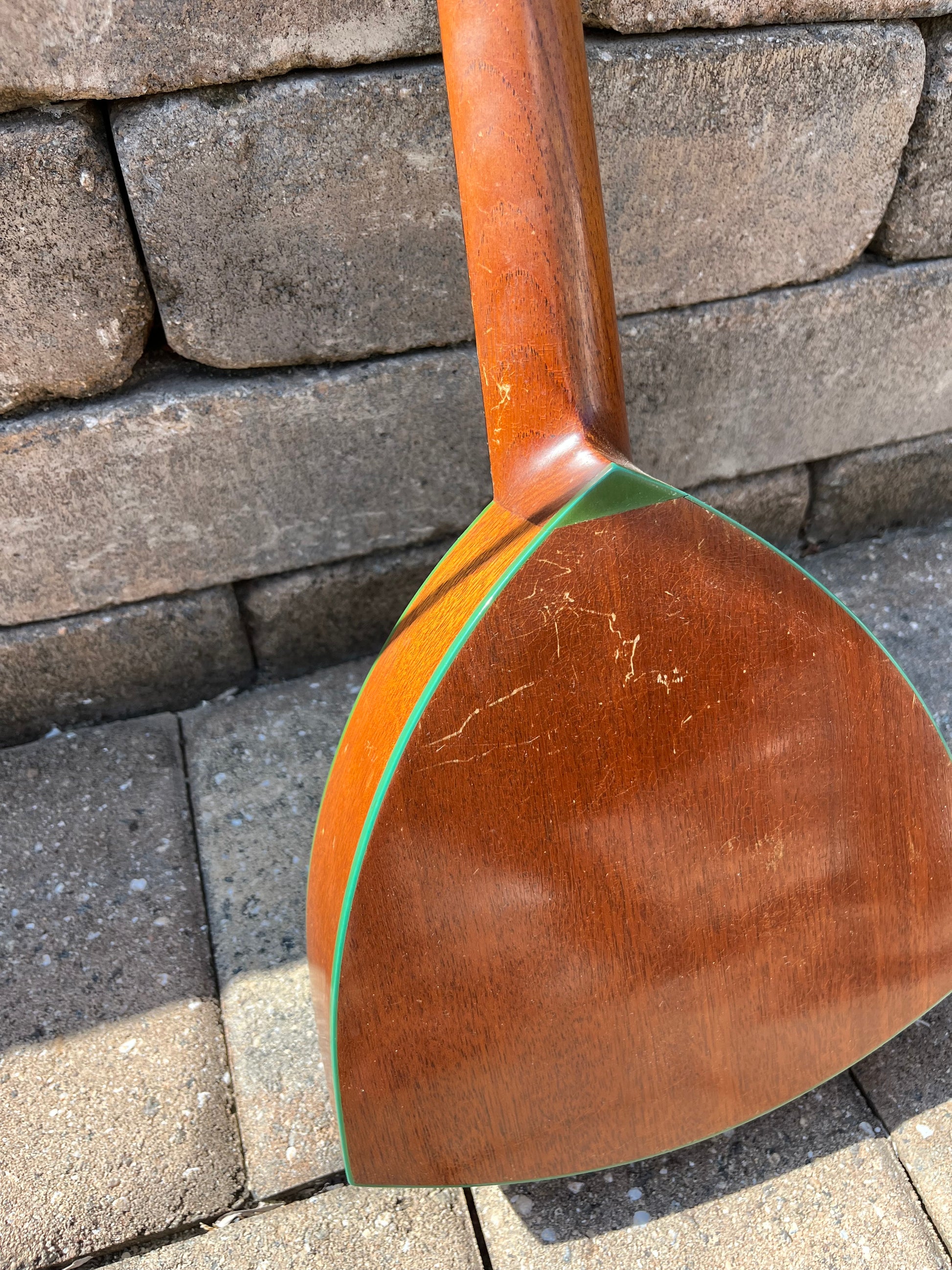 Vintage Washburn ukulele made by Lyon & Healy during the 1930’s. This particular ukulele is a very rare unusual shape as noted in the pictures that was called a Shilners ukulele. Mahogany wood shows typical play wear on it from a piece being so old in age but there are no cracks. Scratches and dings are on the body but over all this piece is in fairly good condition, green binding gives it a cool off cool adding to the unusual body shape. Uke will ship in the original Hardshell case.