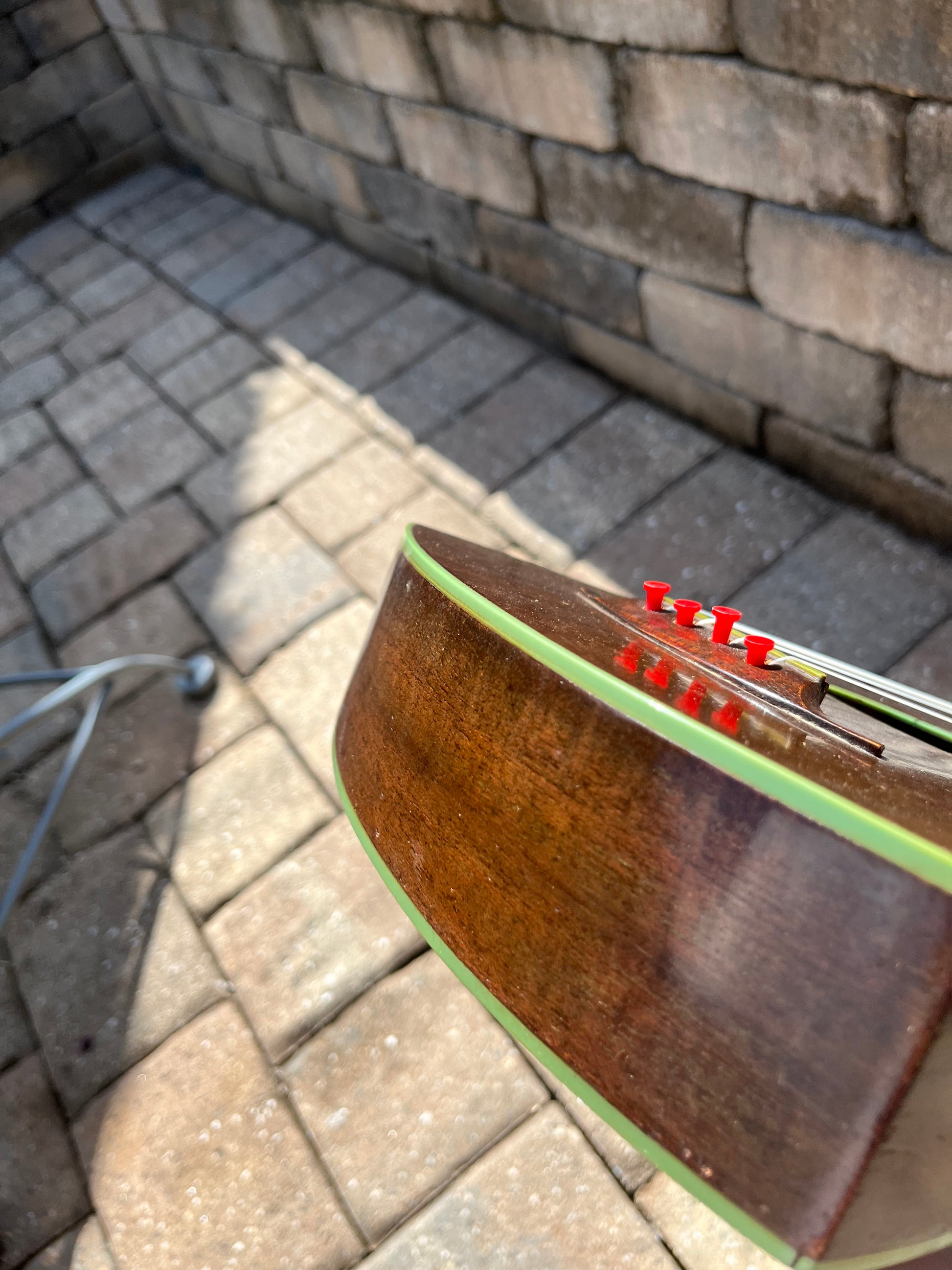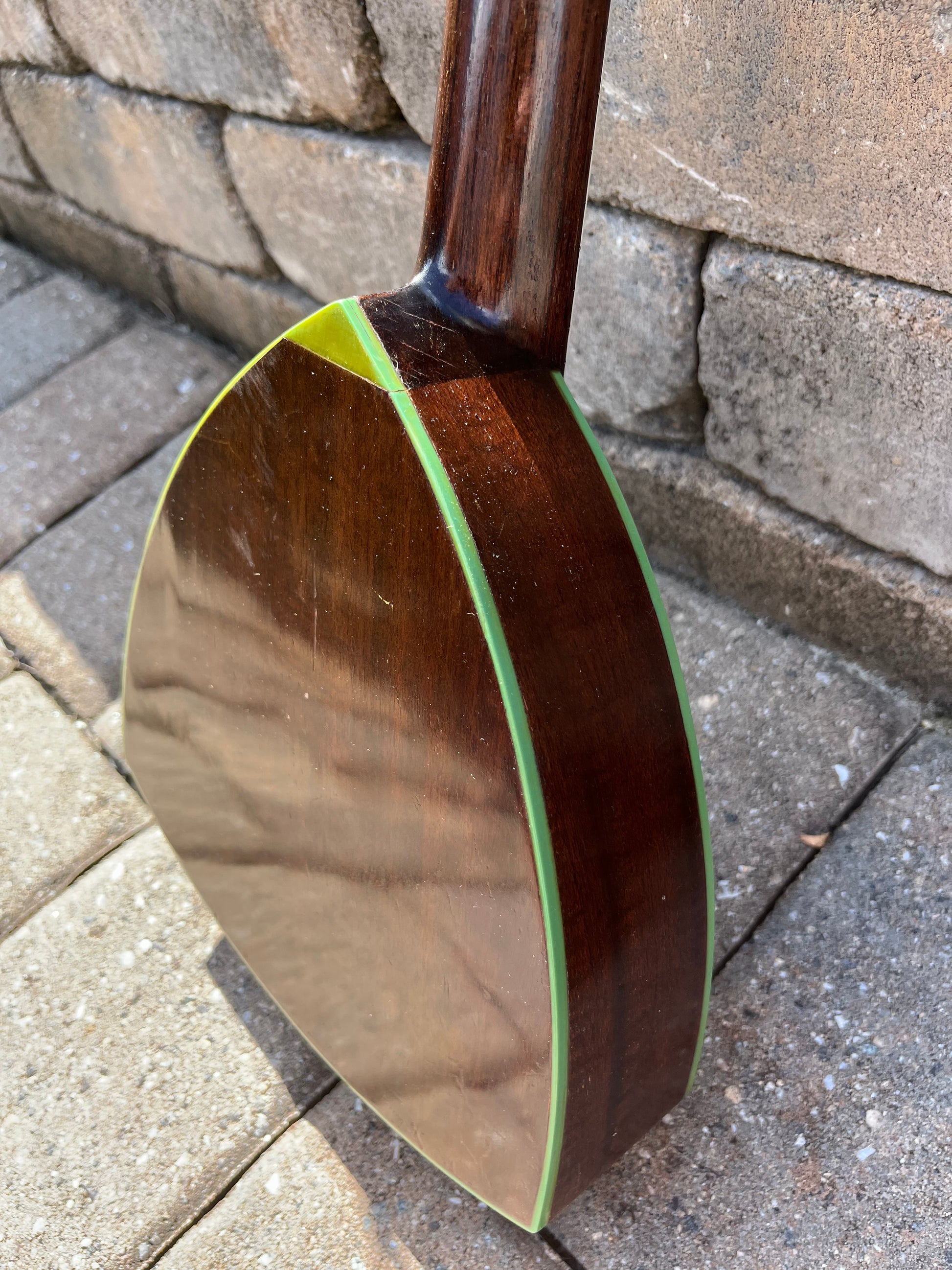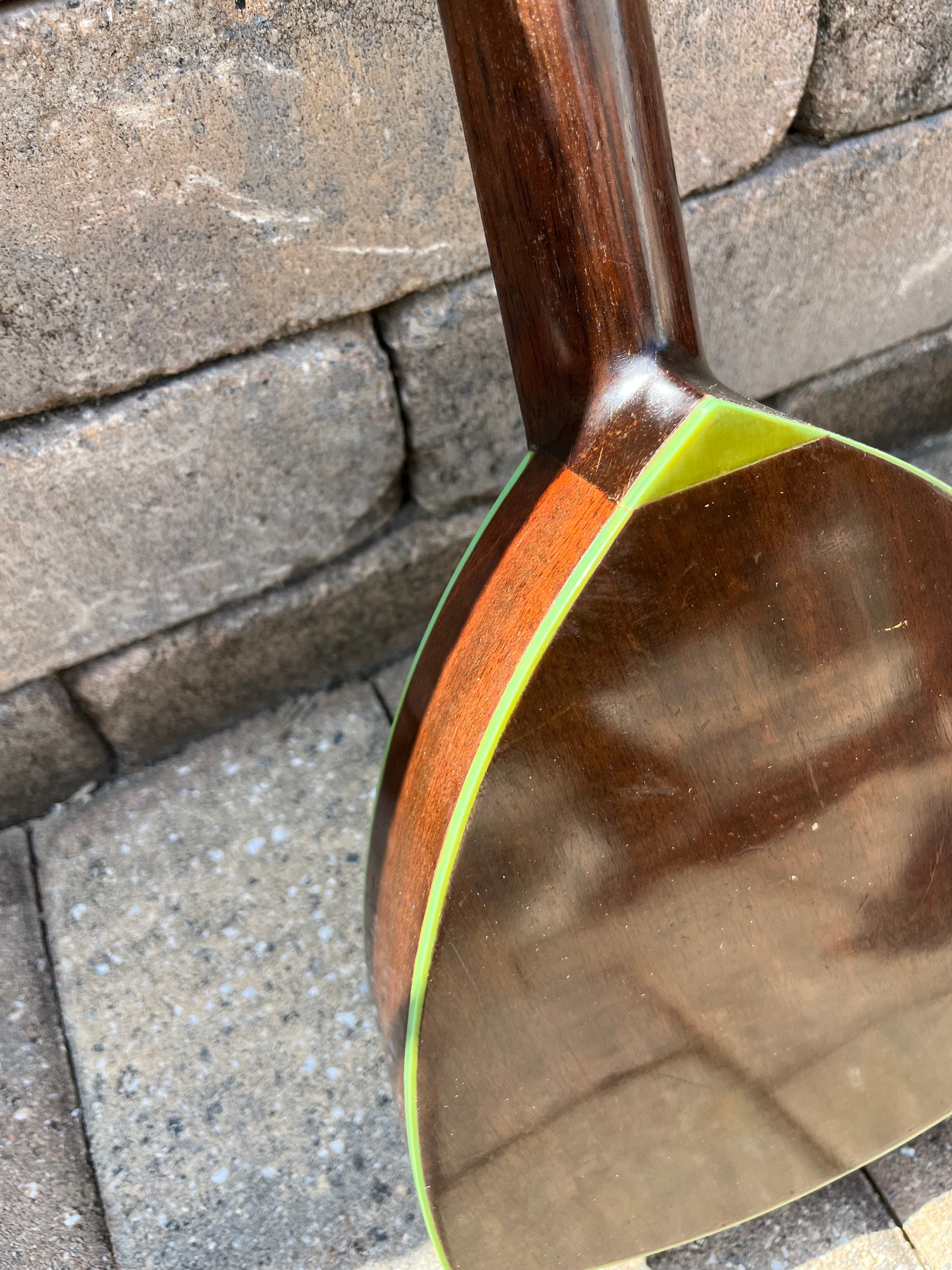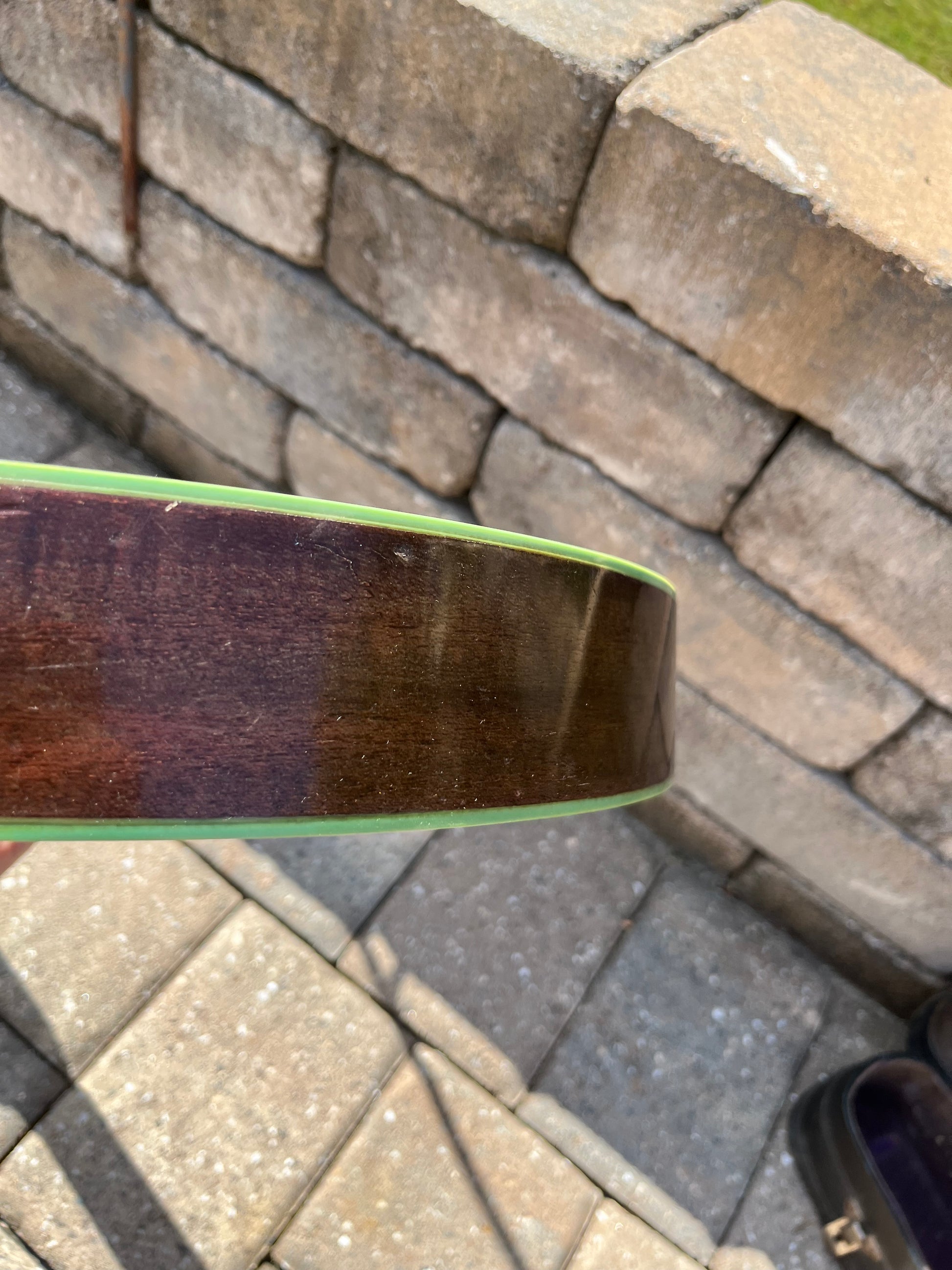 Vintage Washburn made by Lyon & Healy Shilners ukulele made in the 1930’s. This ukulele has a dark mahogany wood to it with the green dot inlay markers, green binding and original red bridge pins. The body shows no cracks with just having your normal small play wear marks from over the years. Very cool rare piece similar to another Washburn Shilners Uke I have listed but with different features. Will ship in what looks to be the original case.