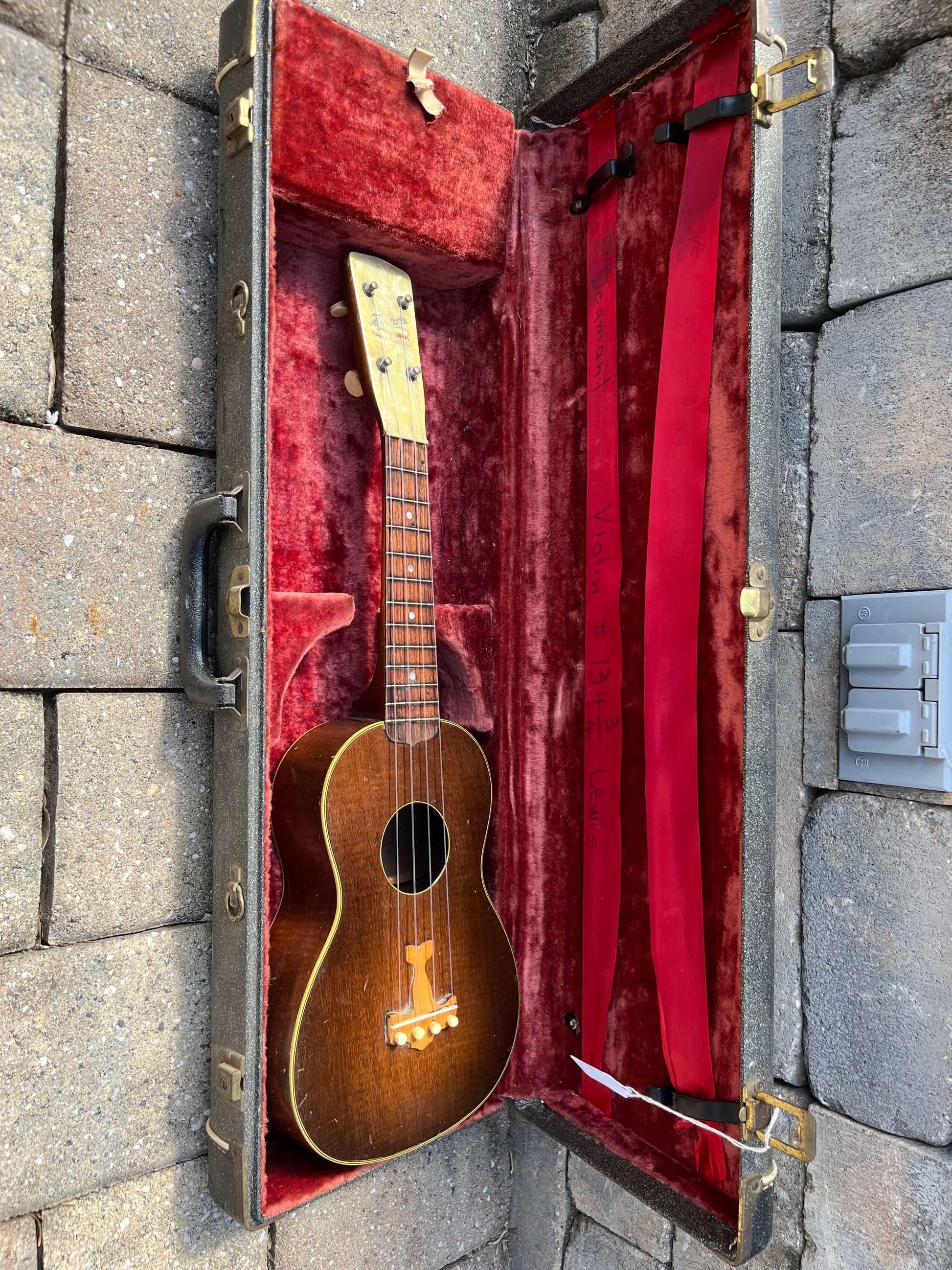 Vintage 1930’s Harmony Tenor Johny Marvin ukulele. This ukulele has beautiful curly maple wood showing even a slight flame to the top. The air plane design bridge is original as these are beyond rare. Ukulele does have one small back crack while it also shows your typical e de play wear with small pings, dings and scratches around the body but is still in fairly good shape for its age. Will ship in the case seen in the pictures.