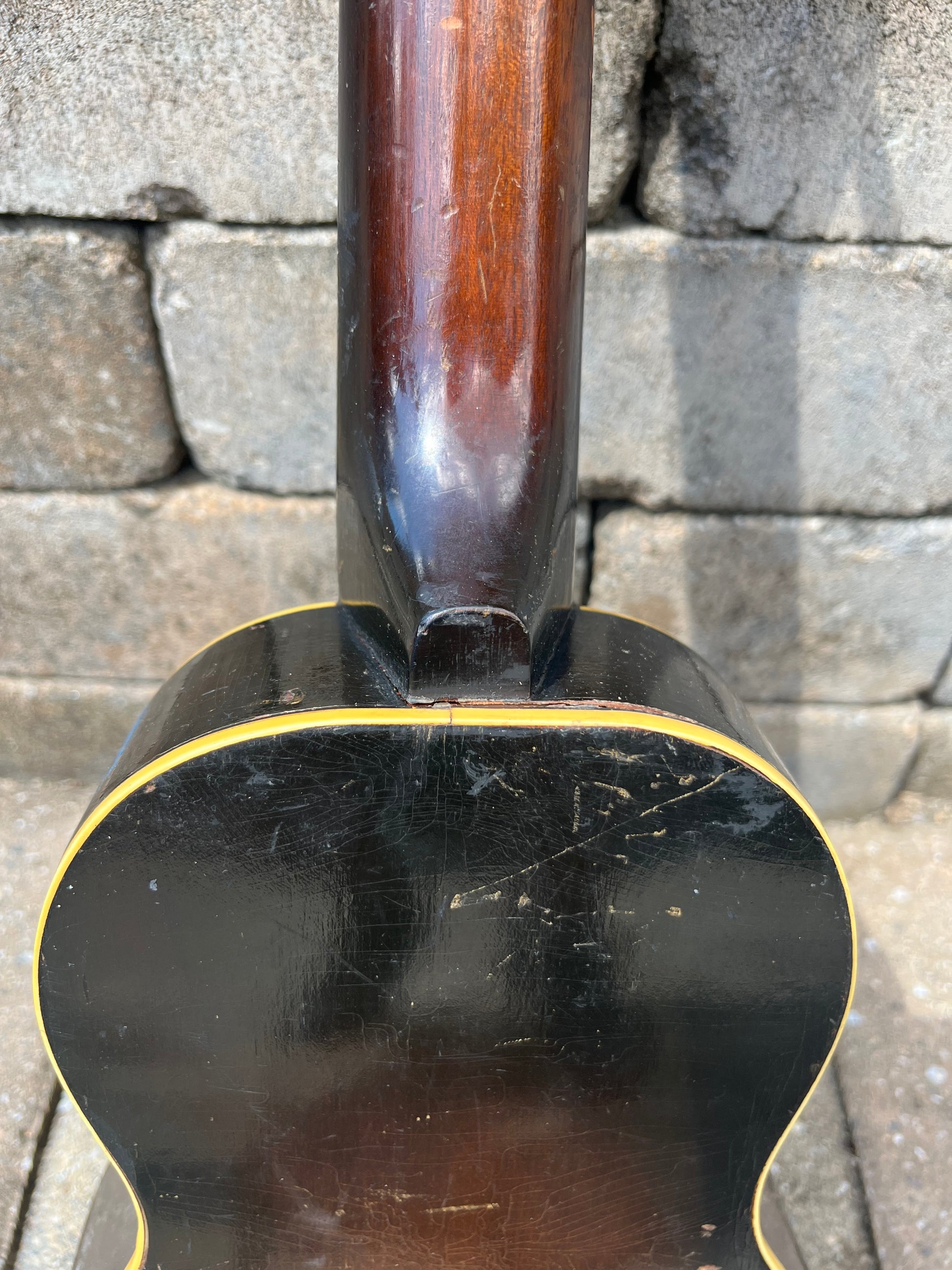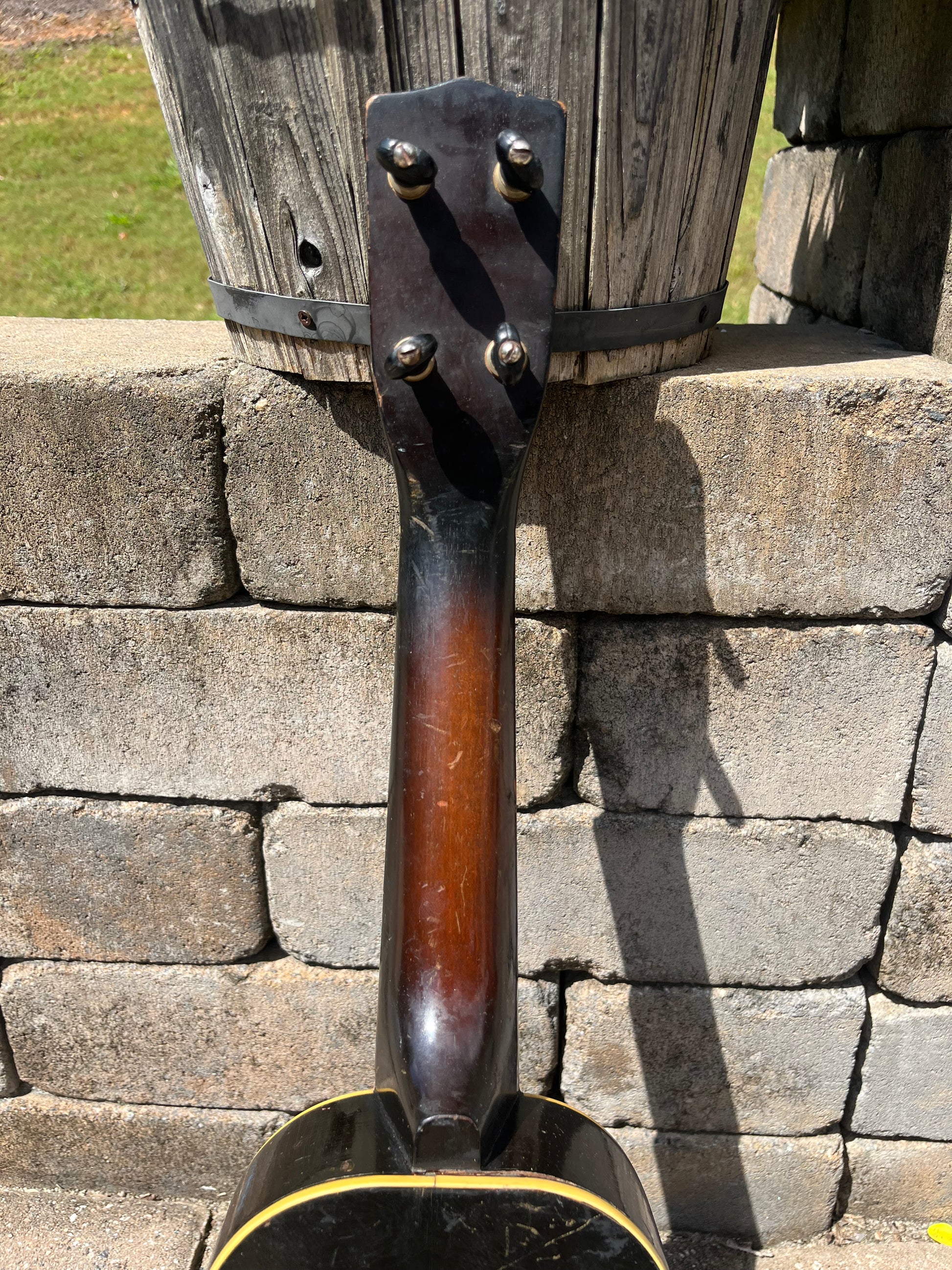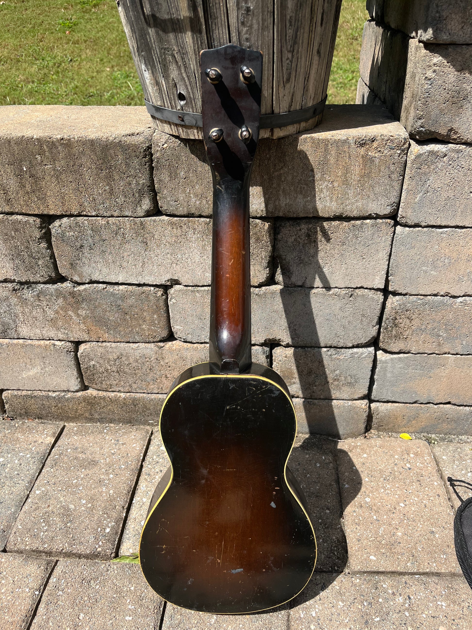 Vintage Johnny Martin Tenor Ukulele made by Harmony. This ukulele shows a lot of age to it as noted by the pictures but is still a very cool original ukulele. 5 smaller top cracks along with numerous pings and dings on the top of the ukulele over all. Sides look to have about 4 cracks also with one or two possibly being just scratches but I will say they are cracks just to confirm. The back looks to be crack free but again has lots of wear and tear spots on it from over the years of being played. Neck and the back of the neck show little knicks and dings from over the years also. Over all a very cool rare piece here in a player grade condition. Will ship in a newer gig bag but will pack accordingly to arrive safely.