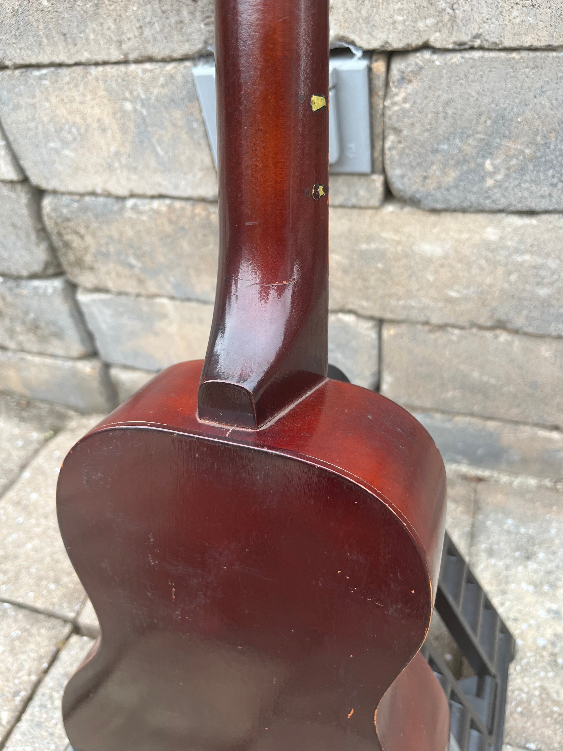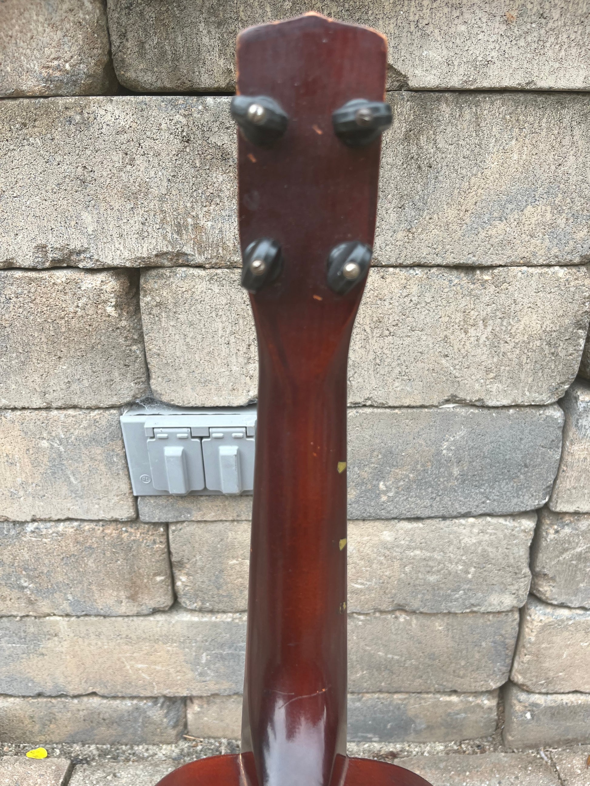 Vintage Regal Wendell Hall TV concert ukulele made in the 1940’s or 1950’s. This ukulele has a spruce top with what looks to be painted maple back and sides, triangle sound hole. Ukulele shows play wear from over the years but no cracks or breaks. Tuners and bridge are original to this ukulele also with the top of the headstock showing a few paint chips but over all a cool vintage piece. Item will be packed accordingly as I don’t have the original case for it.