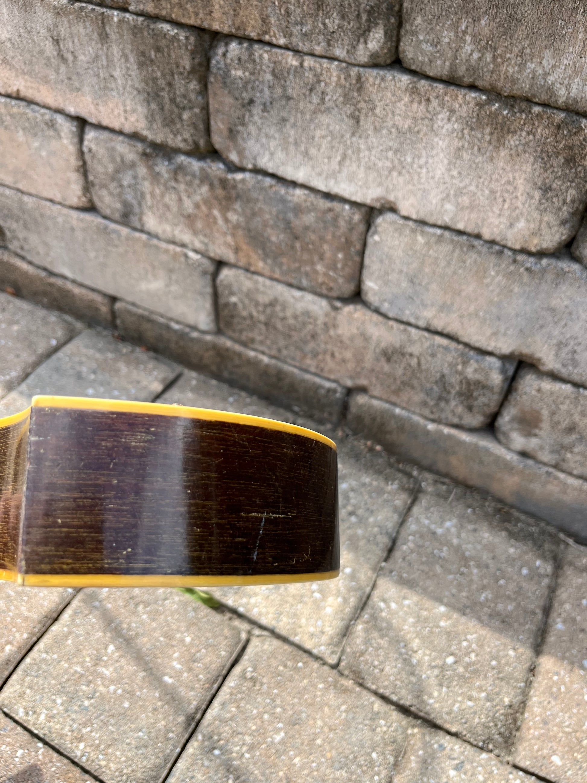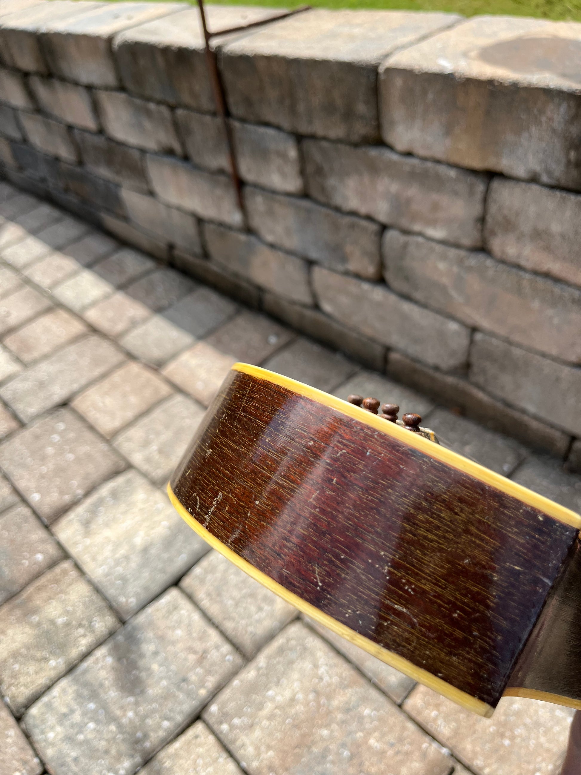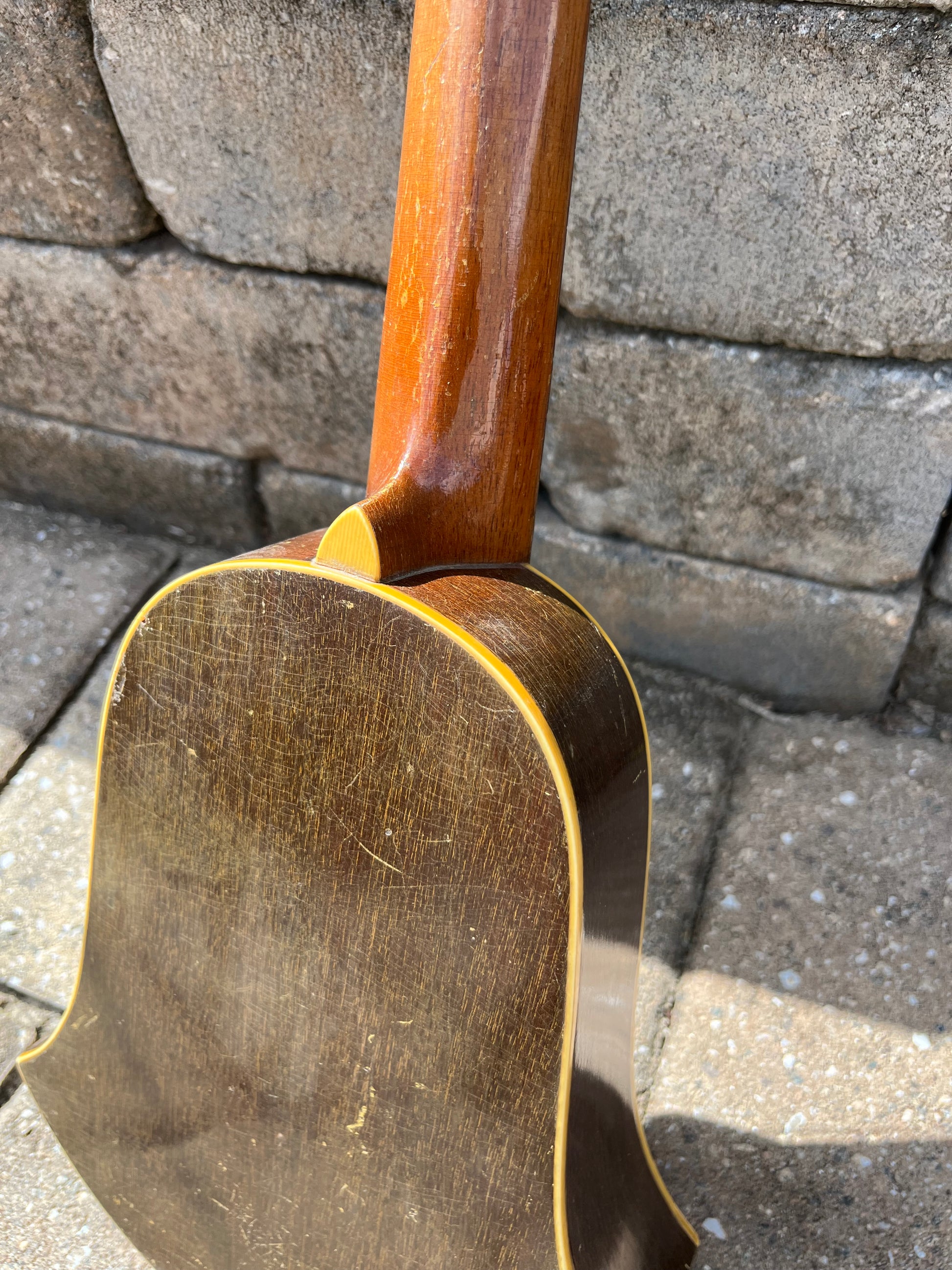 Vintage 1930βs Washburn Bell Ukulele made by Lyon & Healy. This ukulele is made out of entire mahogany being a very short lived variation of the Washburn Bell guitar. This ukulele shows a lot of finish checking to while having your normal play wear with scratches, pings and dings around the body. Very small ball point end hole on the back which I can not say for sure itβs from but it is there. Neck shows average play wear also. Will ship in a newer gig bag case.